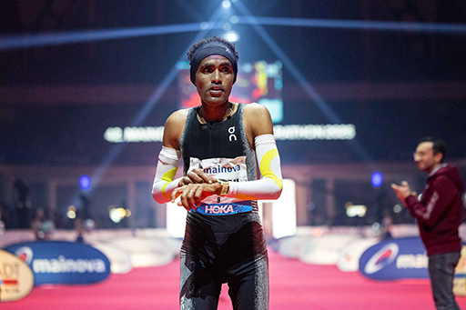 Landsmann Taresa Bekuma, der nach 2:07:01 die Festhalle erreichte. Als Dritter